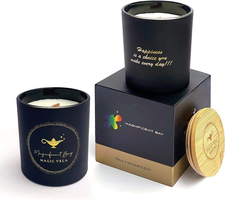 This soy wax candle is such a great combination of high quality and an unbeatable price - definitely worthy of stocking up on! The luxurious black jar, gold writing, and wooden lid make it visually stunning. And the smell? Oh my goodness...it's rich yet soothingly warm scent creates a cozy ambiance that truly rivals many luxury brands. Plus its special wooden wick will give you maximum performance without extra noise from crackling flames. Thanks to this amazing product recommendation by a friend, I'm certainly not disappointed!